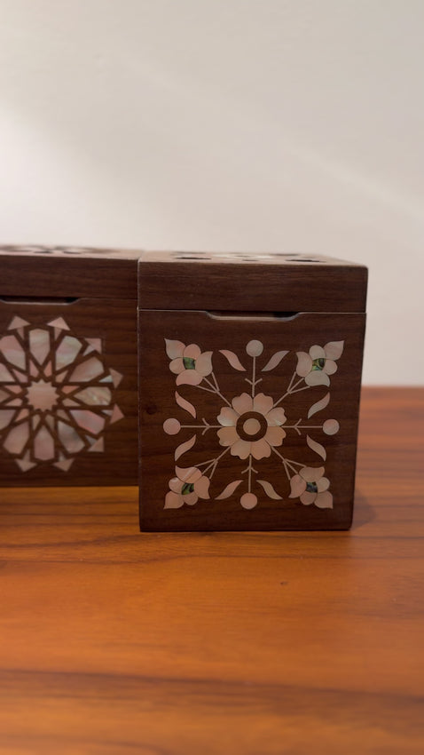 Bahrain Mubkhar is inspired by the Bahraini architect, This walnut wood inlaid with mother of pearl is inspired by this beautiful architecture technique.